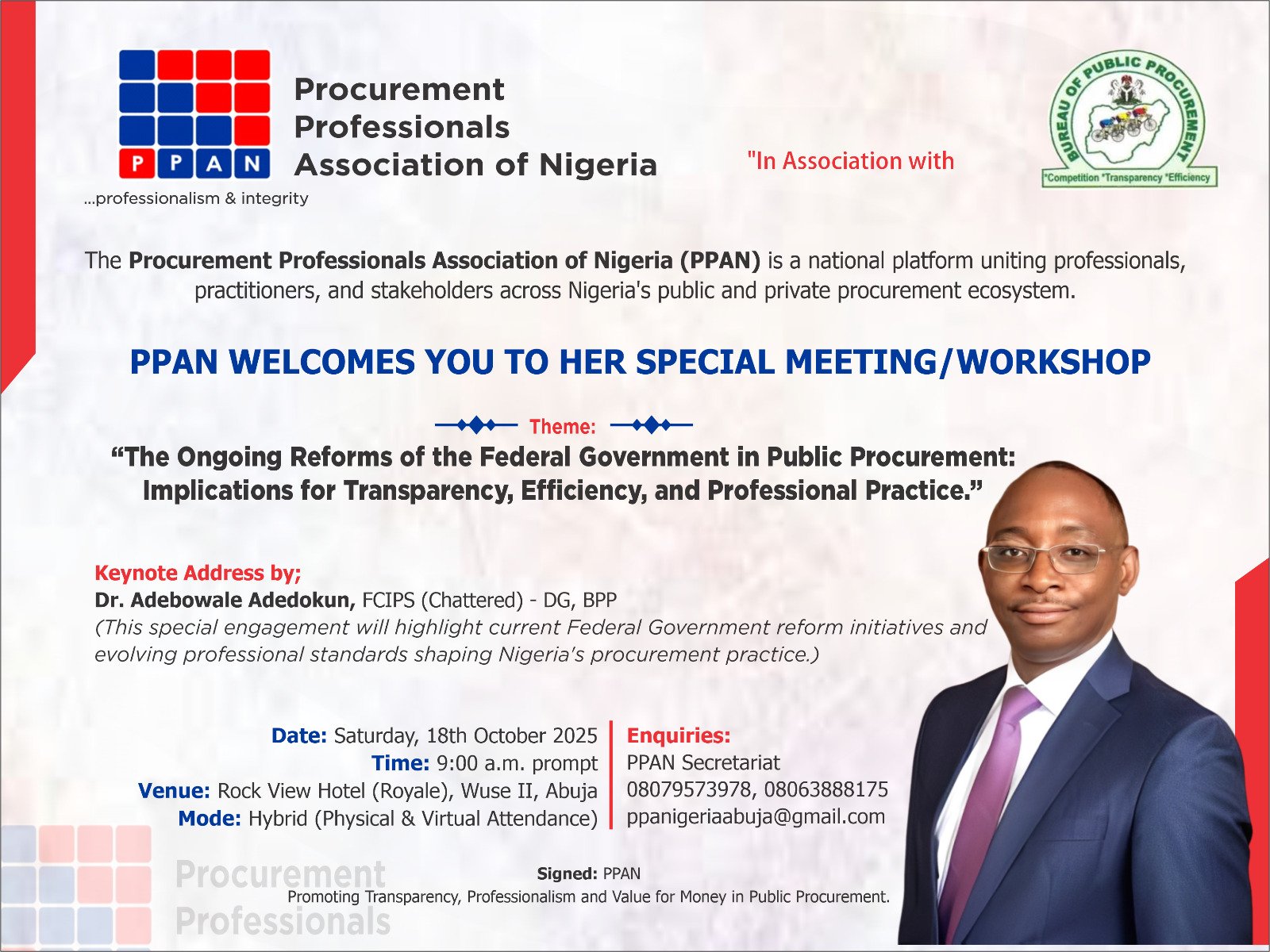 The Procurement Professionals Association of Nigeria (PPAN) invites you to our Special Meeting/Workshop of the Association scheduled as follows:
